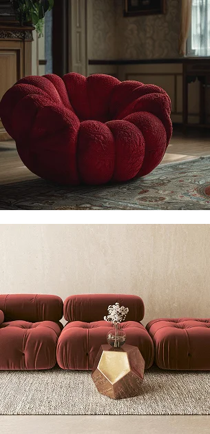 The top image features a grand, modern living room with a large, bespoke black-and-white graphic area rug. The bottom image shows a cozy space with a plush, high-pile lavender shaggy rug.